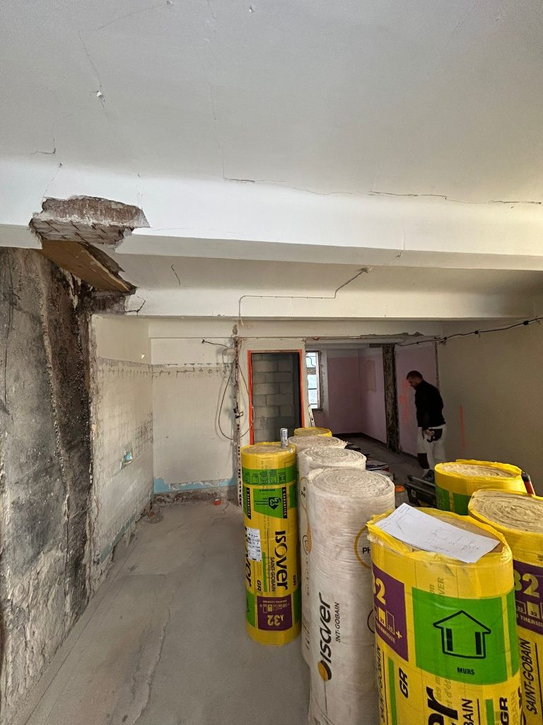 Le chantier a débuté par la préparation des supports, puis la mise en place d’une ossature adaptée permettant la pose de plaques de plâtre sur l’ensemble des murs concernés. Cette étape a permis de retrouver des surfaces planes, saines et durables.