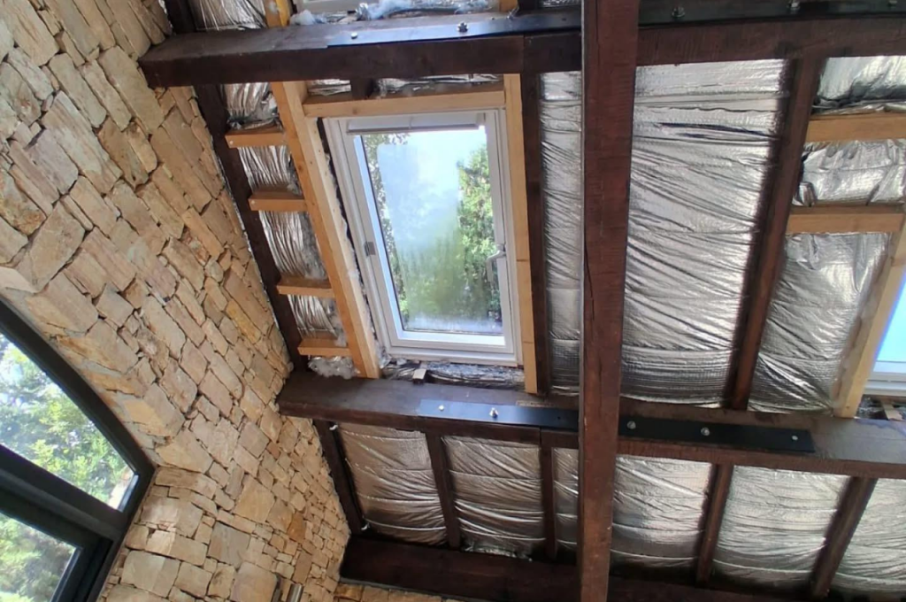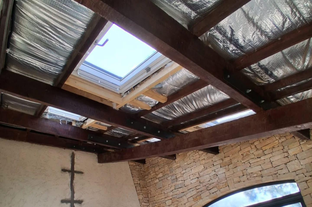 L’intervention a consisté en la pose d’une isolation performante, intégrée entre la structure existante, afin de limiter les déperditions de chaleur et d’améliorer le confort en toute saison. Un travail soigné a ensuite été réalisé sur le plafond, avec la reprise des surfaces et une finition nette et homogène.